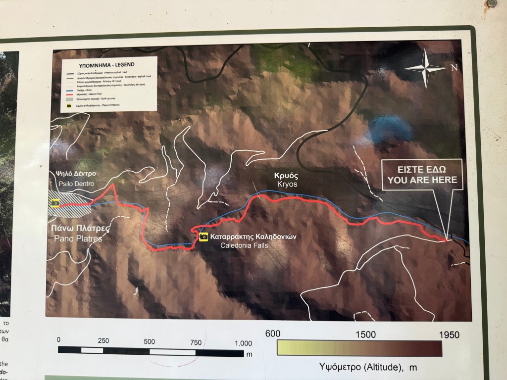 Der Kaledonia-Trail kann übrigens auch in entgegengesetzter Richtung gewandert werden, also bergauf vom Restaurant Psilo Dendro aus zum Wasserfall – was deutlich fordernder ist. Alternativ kann man auch nach dem Erreichen des Wasserfalls den gleichen Weg zurückgehen, anstatt dem Trail weiter bergab zu folgen.