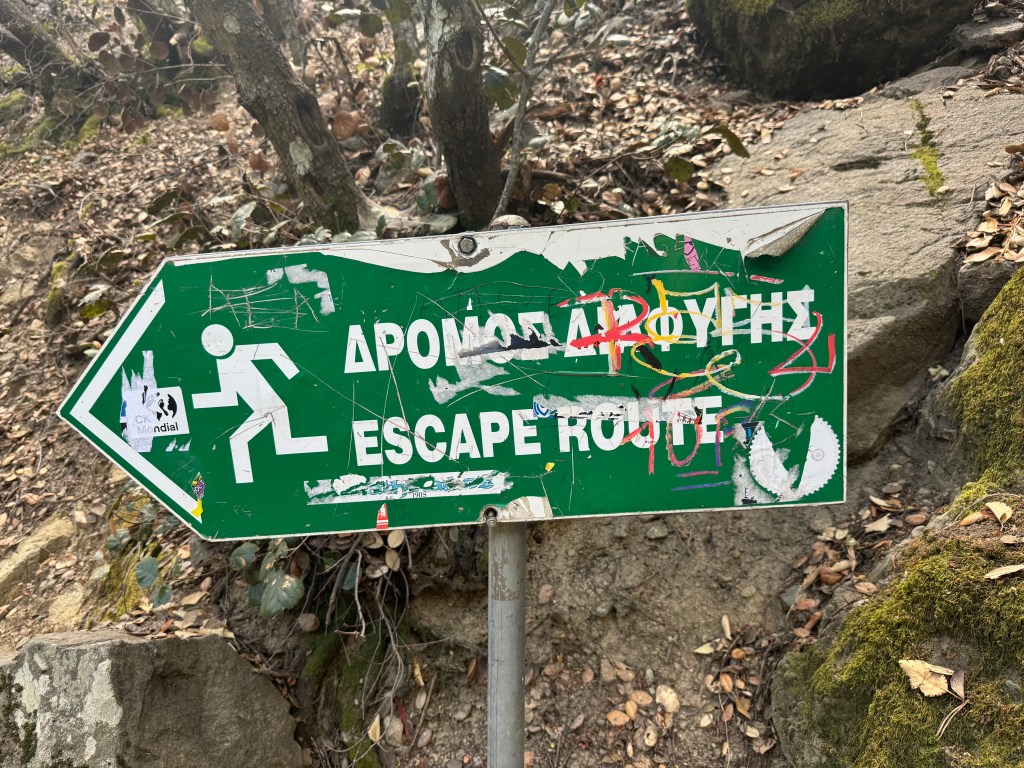 Der Rückweg verlief für die meisten über den weiteren Teil des Trails, der nach etwa einem Kilometer am Restaurant Psilo Dendro endete. Nur wenige Teilnehmer wählten alternativ die sogenannte Escape Route, eine deutlich leichtere, besser befestigte Wegführung, die sich vor allem für Personen mit Knieproblemen oder eingeschränkter Kondition eignet. Sie bietet einen deutlich bequemeren Abstieg, ist allerdings weniger reizvoll, da sie größtenteils auf breiteren Wegen mit weniger direktem Naturkontakt verläuft. Beide Routen enden jedoch am selben Ort.