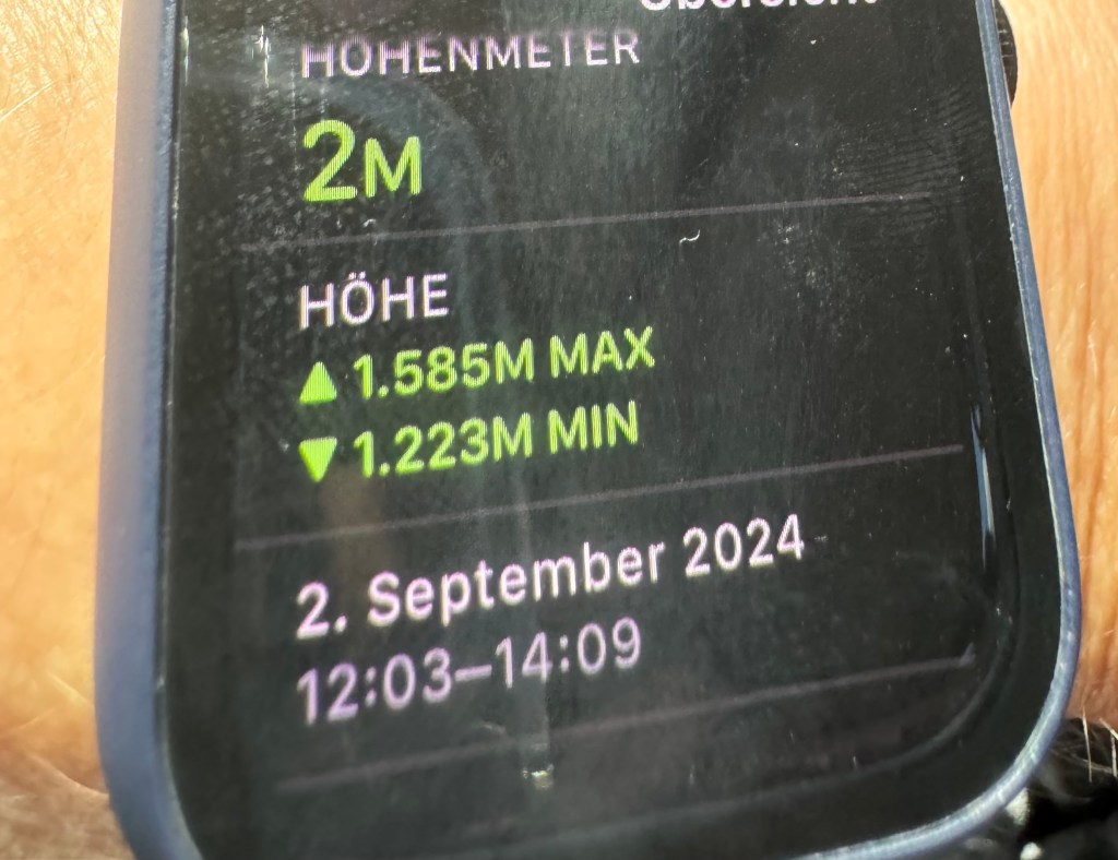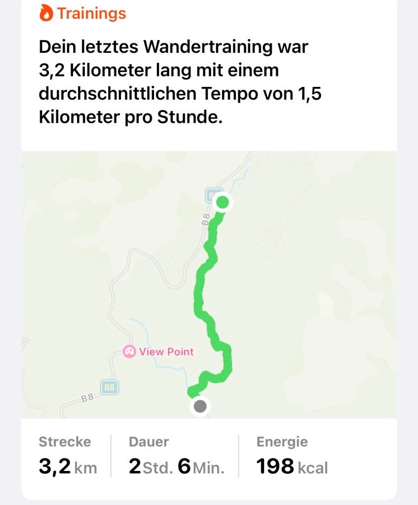 Die reine Gehzeit betrug 2 Stunden und 6 Minuten, mit mehreren kurzen Pausen für Erläuterungen der Reiseführerin, Fotos und Erholung. Trotz der Anstrengung war die Wanderung ein Genuss – der Schatten der hohen Bäume und die frische Bergluft machten das Gehen angenehm.